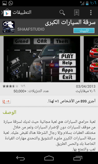 لعبة سرقة السيارات الكبرى والتي يقوم فيها المستخدم بممارسة دور المجرم من سرقة وضرب وقتل وما إلى ذلك، وتم تصنيفها بأنها صالحة لفئة (بلوغ منخفض) أيضاً.