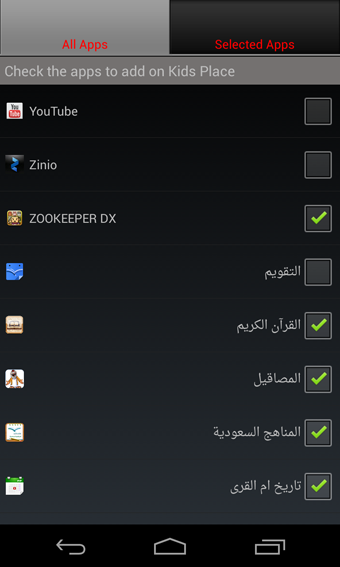 نختار الزر المتبقي، سينقلنا هذا الزر إلى شاشة بها قائمة بكل البرامج الموجودة على الجهاز، ما عليك هنا إلا اختيار البرامج التي تريدها أن تظهر لطفلك، كما يلي: