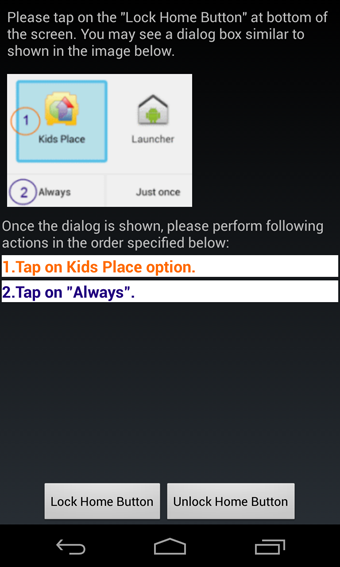 الزر الأخضر الأول (Lock Home Button) يقوم بربط زر الهاتف الرئيسي بهذا البرنامج، أي أنه عندما يعمل البرنامج ويقوم الطفل بضغط الزر الرئيسي السفلي في الهاتف فإن الشاشة الرئيسية المعتادة لن تظهر له، بل ستظهر له الشاشة الرئيسية لبرنامج التحكم الوسيط هذا، وذلك حتى نمنع الطفل من الخروج من دائرة هذا البرنامج.