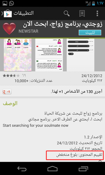 وجدير بالذكر هنا أن أغلب برامج التعارف وبرامج الزواج العربية مصنفة على أنها إما صالحة للجميع من صغار وكبار، أو مصنفة (بلوغ منخفض).