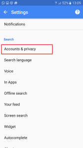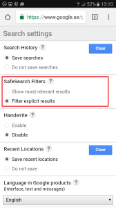في تطبيق جوجل Google، اختر (الإعدادات – Settings)، ومنها اختر (الحسابات والخصوصية – Accounts & Privacy)، ستجد من ضمن الخيارات المتاحة خيار (فلتر البحث الآمن – SafeSearch filter)، يمكن تفعيله من هنا مباشرة.