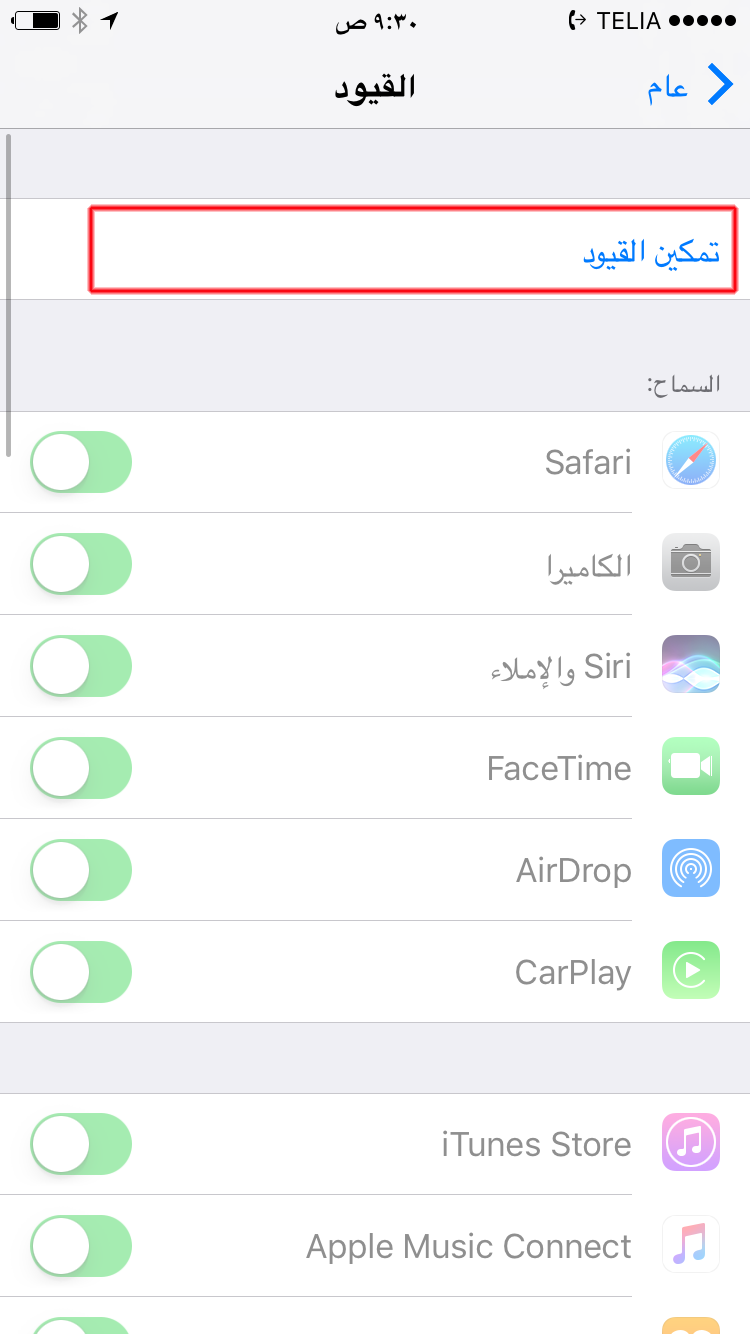 اذهب إلى (إعدادات  – Settings) الخاصة بجهاز الآيفون أو الآيباد، اختر (عام – General)، ومنها اختر (القيود – Restrictions)، ثم قم بتفعيل القيود (Enable Restrictions) إن كنت قد فعلت القيود من قبل ووضعت لها كلمة سر مسبقاً فسيطلب منك إدخال كلمة السر، وإن كانت أول مرة تفعل القيود فسيطلب منك الجهاز إدخال كلمة سر جديدة، ثم إدخالها مرة أخرى للتأكيد.