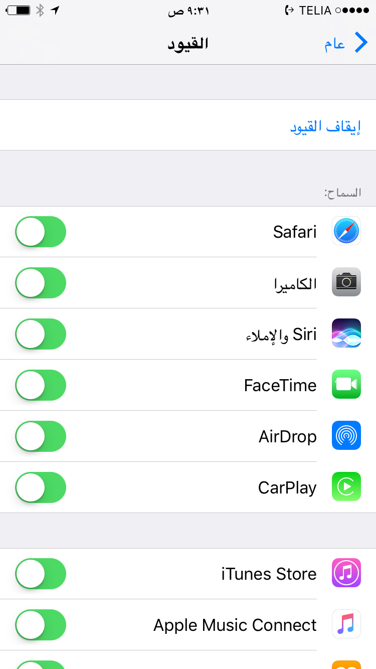 يمكننا الوصول للقيود بالدخول على “الإعدادات – Settings”، ثم “عام – General”، لنجد بند “القيود – Restrictions”، والتي نجدها في الأصل معطلة.